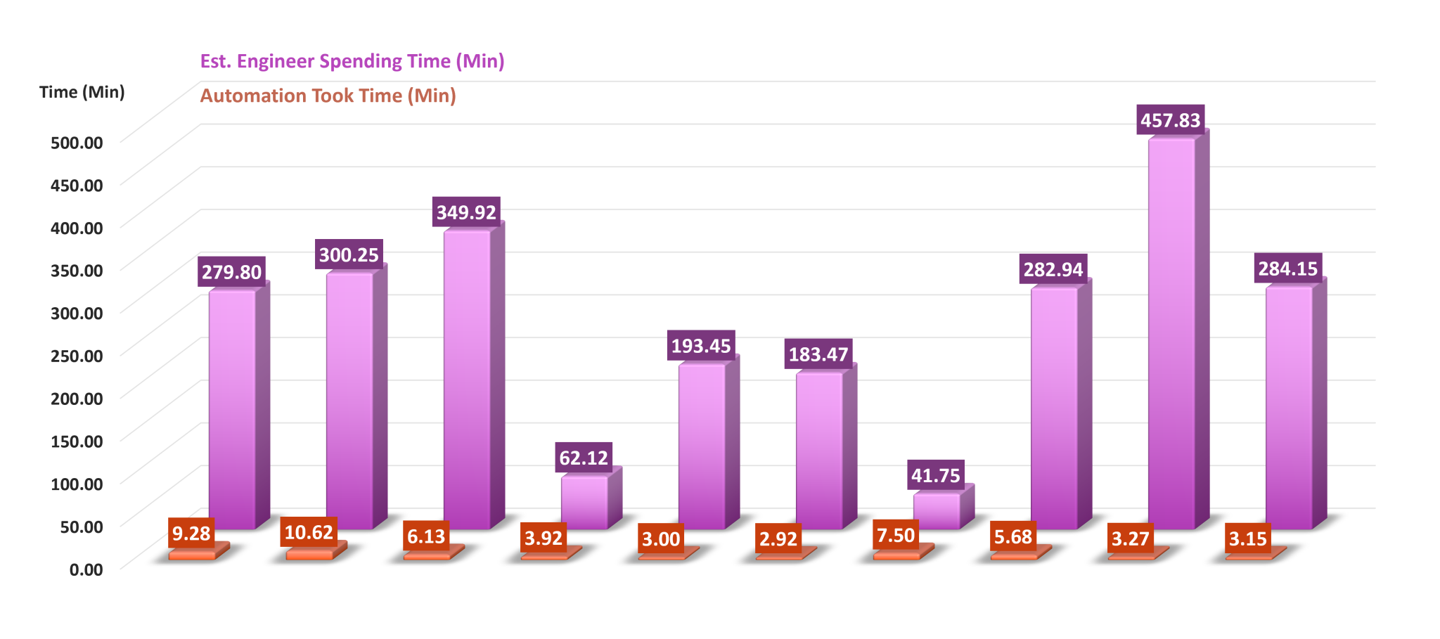 从2023年的Layout专案加以分析、比较自动化与人工检查的工时,图2明显可看出两者的差距已超过十倍,甚至是百倍以上,由此可知自动化对于布局审查作业,有显著提高效率的贡献。