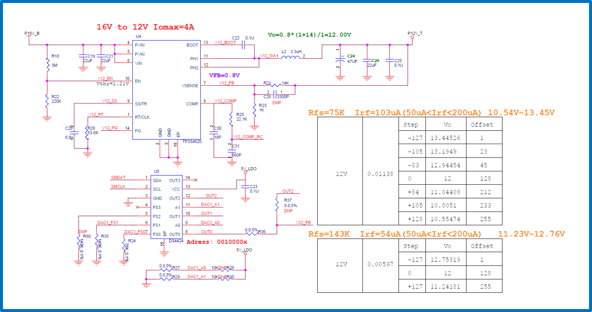 透过 DAC 输出的电流直接作用在反馈分压网路上,达到微调输出电压的效果。